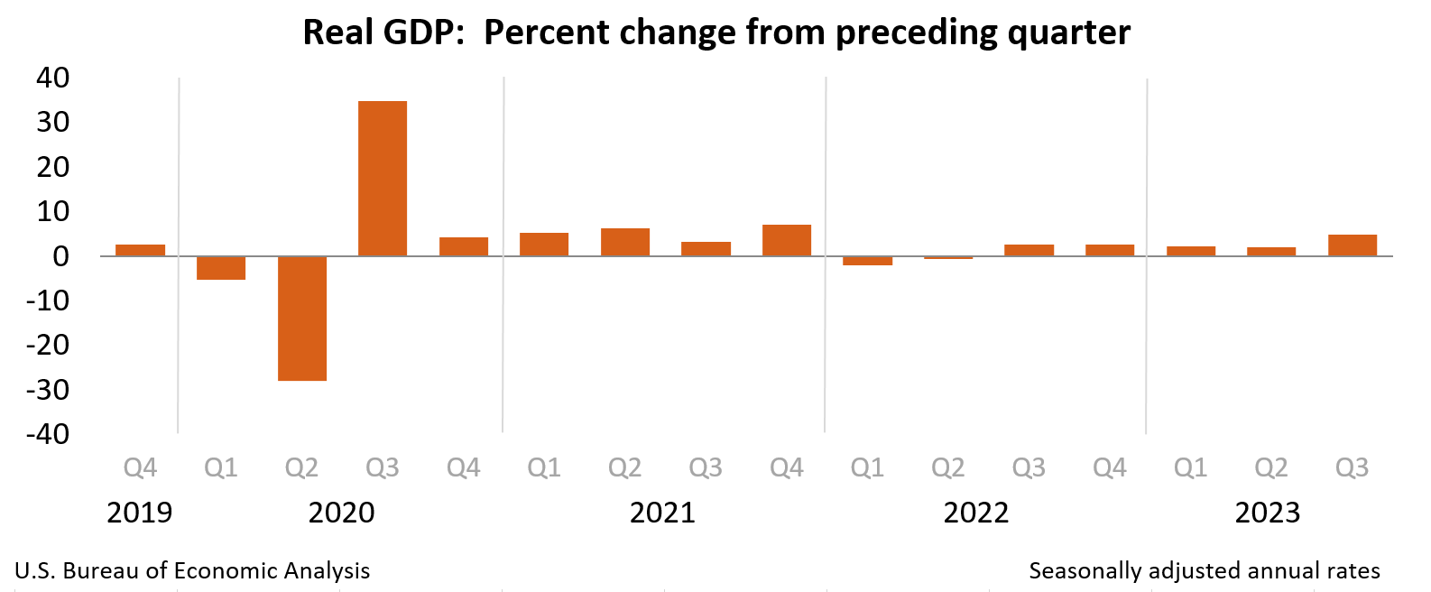 Perekonomian AS menunjukkan kinerja yang kuat di Q3 2023, dengan pertumbuhan GDP tahunan sebesar 4,9%, melampaui perkiraan sebesar 4,3% dan menunjukkan peningkatan yang nyata dari 2,1% yang terlihat di kuartal sebelumnya. Pertumbuhan GDP riil yang kuat ini didorong oleh serangkaian faktor, khususnya terdapat peningkatan yang nyata di berbagai bidang seperti belanja konsumen, investasi inventaris swasta, ekspor, belanja pemerintah negara bagian dan lokal, belanja pemerintah federal dan investasi tetap perumahan. Namun, peningkatan ini sedikit tertahan oleh penurunan investasi tetap non-perumahan. Selain itu, penting untuk dicatat bahwa impor, yang bertindak sebagai pengurang perhitungan GDP mengalami peningkatan selama periode ini.