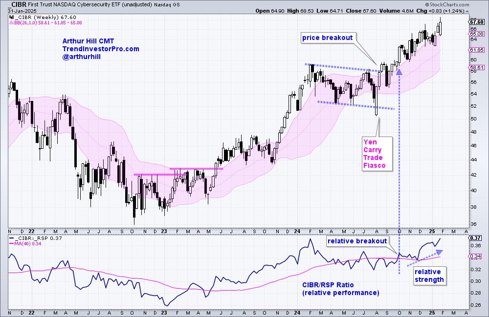 The indicator window shows the CIBR/RSP ratio to measure relative performance. This ratio rises when CIBR outperforms the broader market (S&P 500 EW ETF (RSP)) and falls when CIBR underperforms. This ratio broke out in early October to signal relative strength in CIBR (relative breakout). The price breakout and relative breakout proved a power combination. Keep this in mind.