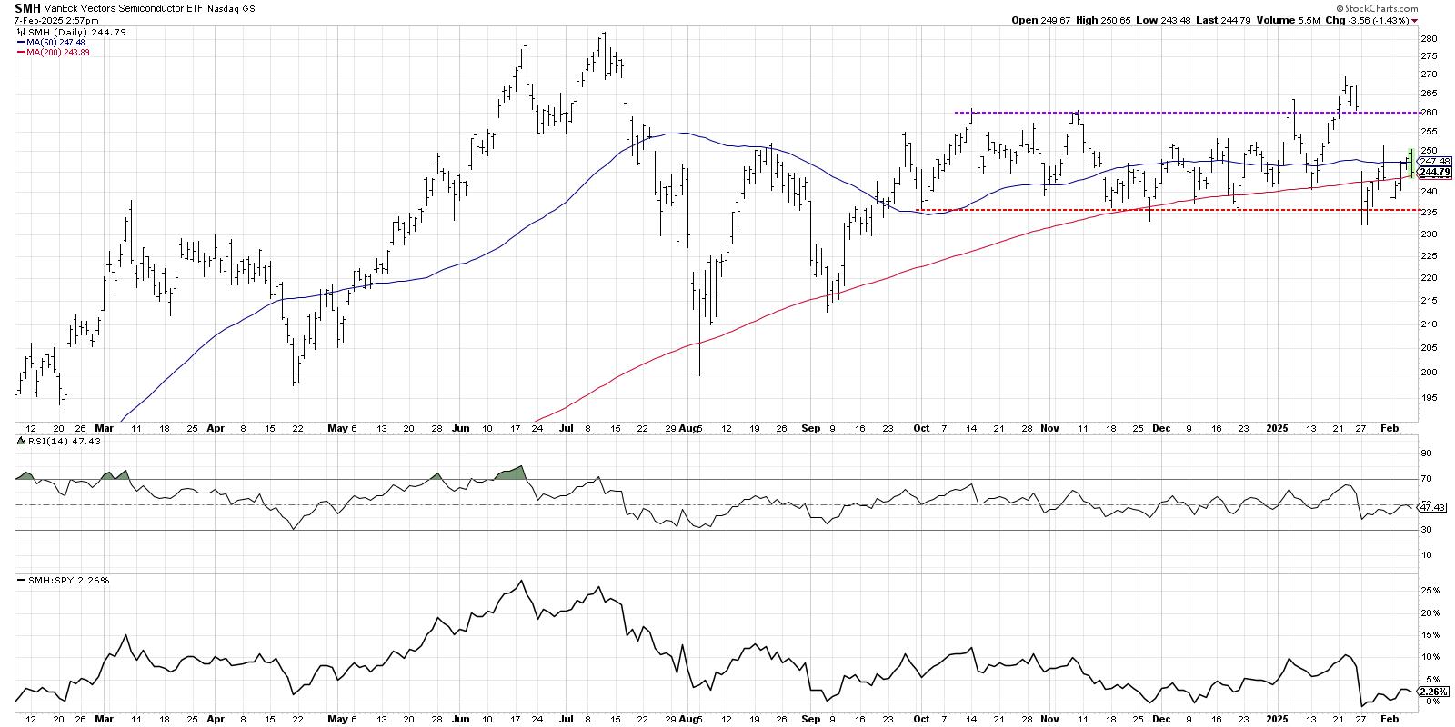 To be honest, the 2024 bull market was dominated by the AI theme, and the AI theme is dominated by semiconductors. At least, that was the prevailing narrative until news of Deepseek AI from China brought that entire thesis into question. From a technical perspective, semiconductors last made a new all-time high in July 2024, and in recent months has settled into a consolidation phase.